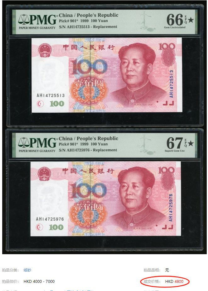 上图是2张1999年100元纸币,他们的拍卖价格达到了4800港币,相当于4500元左右的人民币,单张来算的话,就是2250一张,主要的原因就是因为它的冠字是AH冠。